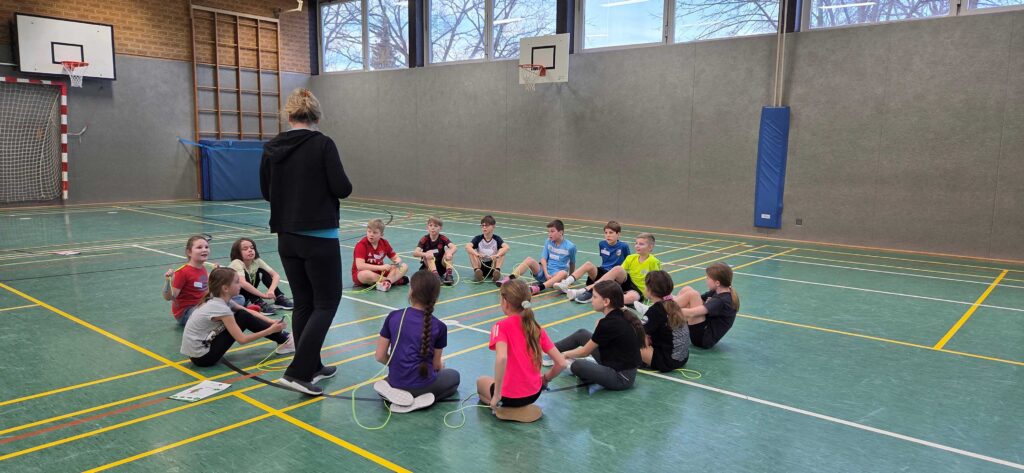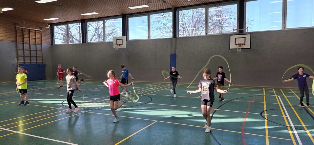 Mit großer Motivation probierten die Kinder anschließend zahlreiche Sprungvariationen aus: Einzelsprünge, Partnersprünge, Laufschritte, Überkreuzsprünge und sogar kleine Choreografien.