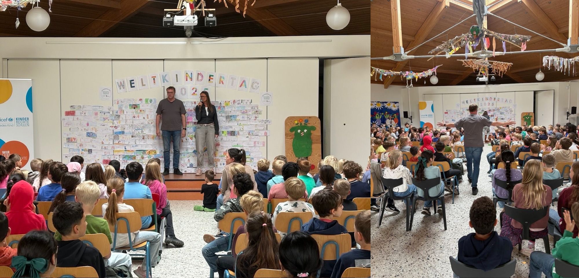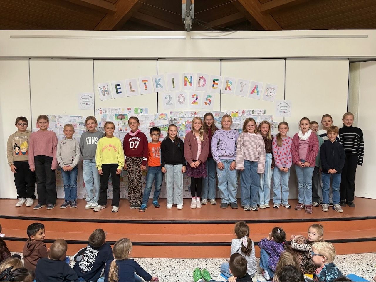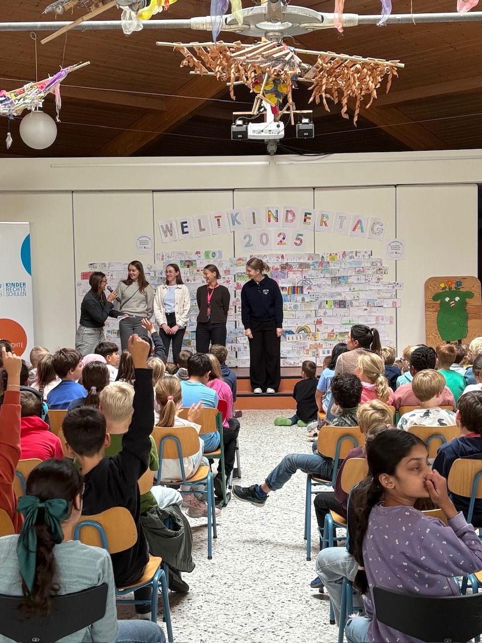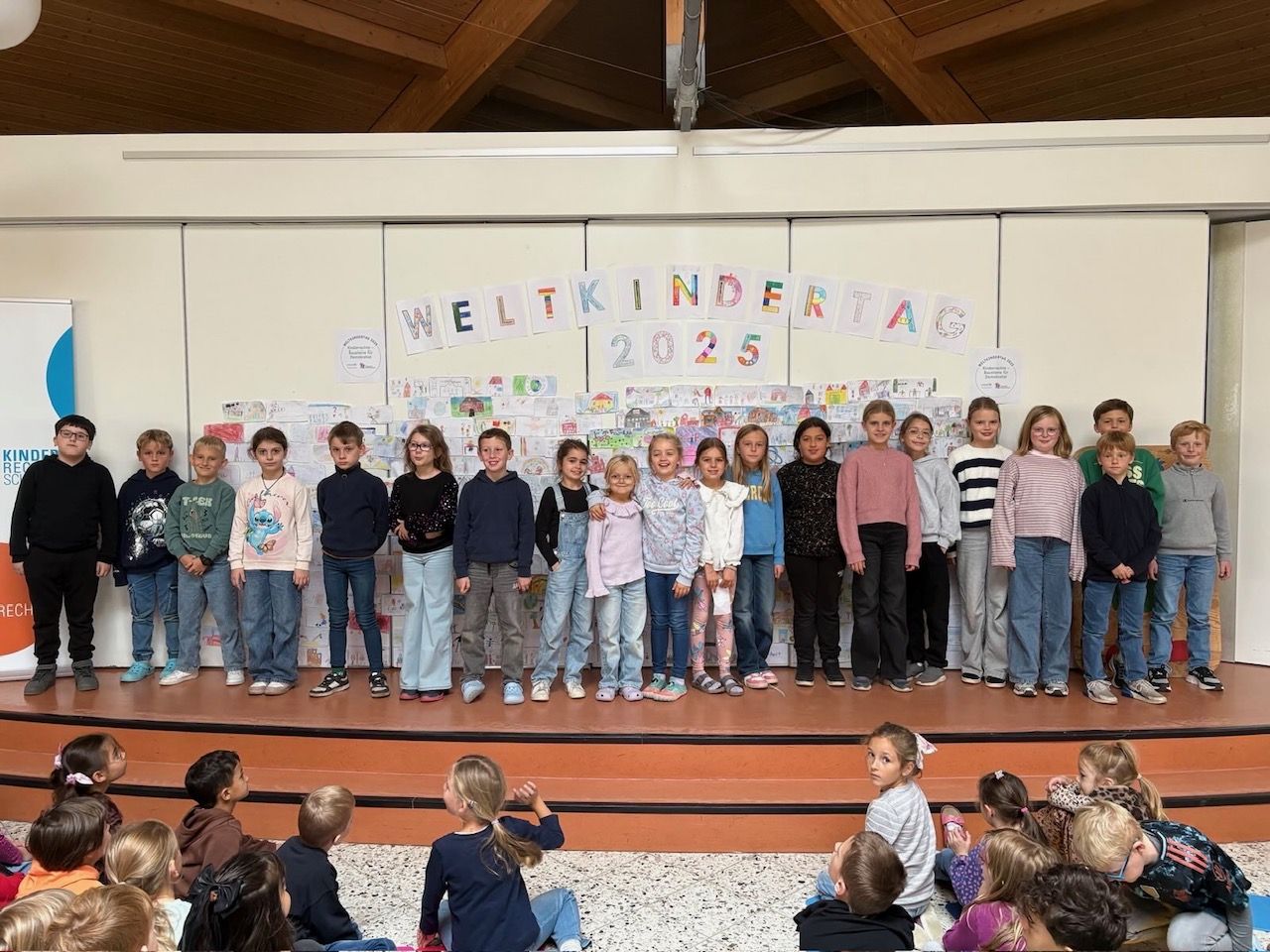 Die Schulversammlung stand v.a. unter dem Motto des Weltkindertages „Kinderrechte-Bausteine für Demokratie“. In den letzten Wochen haben sich die Kinder mit dem Thema der Kinderrechte beschäftigt. Im Anschluss konnte jedes Kind einen eigenen Baustein mit dem persönlich wichtigsten Thema gestalten. Die Bausteine ergeben nun eine große „Mauer der Demokratie“, die in der Aula ausgestellt ist, zum Verweilen einlädt und wirklich beeindruckend ist.