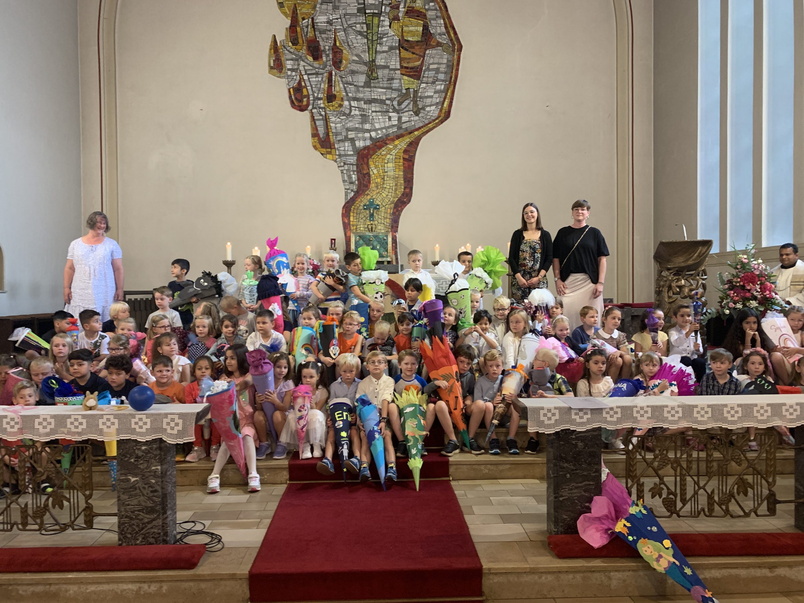 Mit einer Segnungsfeier wurden am 19.08.2023 71 neue Schülerinnen und Schüler an der Overbergschule aufgenommen. Der Wortgottesdienst wurde von dem Jahrgang 2 der Schule vorbereitet und begleitet. Ein großer Dank gilt Pastor Sebastian für die Durchführung und Sigrid Hellmann für die musikalische Unterstützung. Anschließend durften die Kinder ihre erste Schulstunde besuchen. In der Zwischenzeit haben der Förderverein und der Schulelternrat die Eltern und Erziehungsberechtigten mit Getränken versorgt, sodass sie in einer entspannten Atmosphäre in den gemeinsamen Austausch treten konnten. Abschließend durften die Kinder ihre Ergebnisse aus der ersten Schulstunde allen Anwesenden präsentieren.