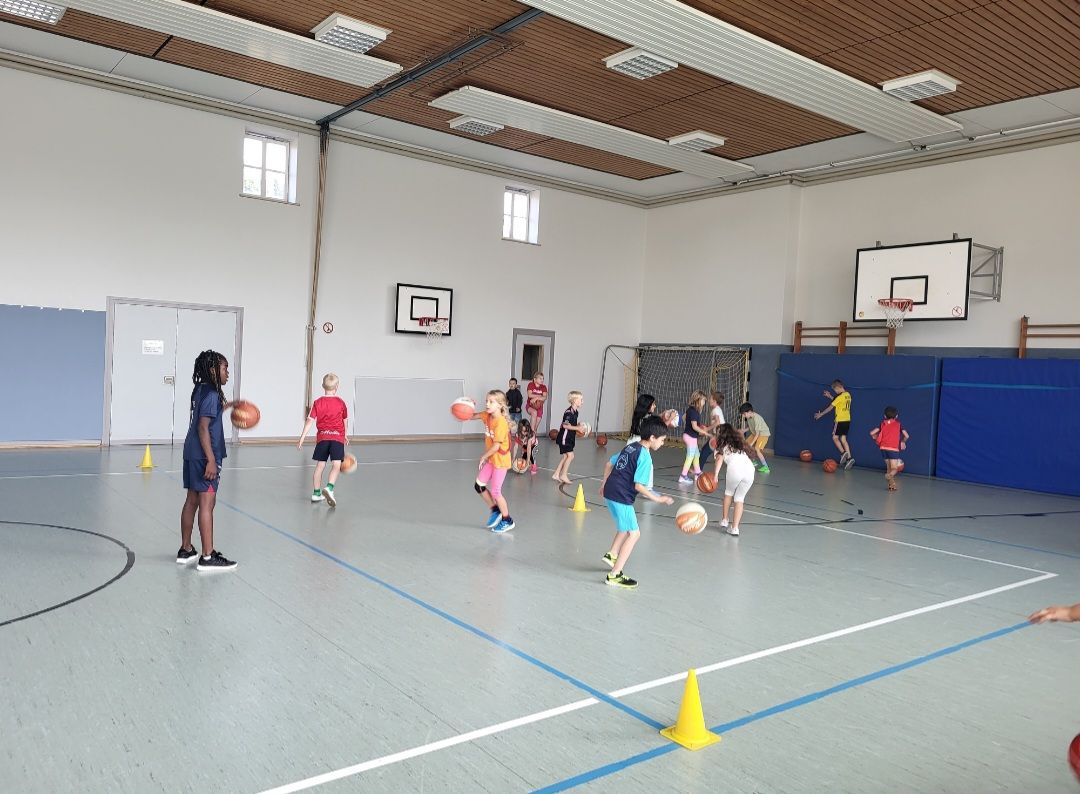 Dribbeln-Passen-Korbwurf: Kürzlich haben alle Schülerinnen und Schüler der Overbergschule in einer Stunde unter Anleitung von den Profis des Rasta Clubs Vechta in die Sportart Basketball geschnuppert. Im Anschluss wurden motivierte Kinder ermutigt, an den Trainingszeiten teilzunehmen. Wie immer: Eine tolle Aktion!