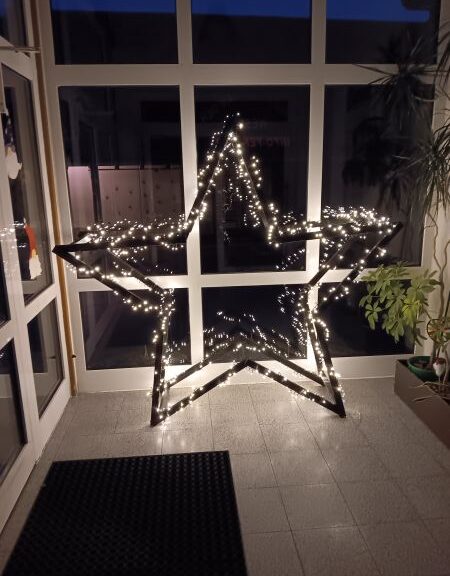 Die Schüler der Klasse 10-12 von Frau Schiffler haben unter Anleitung für die Schulgemeinschaft einen beleuchteten Stern hergestellt. Dieser Stern hat seinen festen Platz im Vorbau des kleinen Hauses gefunden. Am 20.12.24 war der Stern in der Lutherkirche Holzminden beim Weihnachtsgottesdienst der Schule an der Weser um 8:30 Uhr zu bewundern.