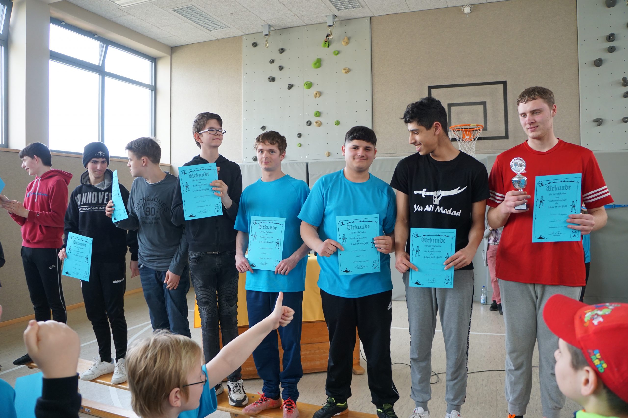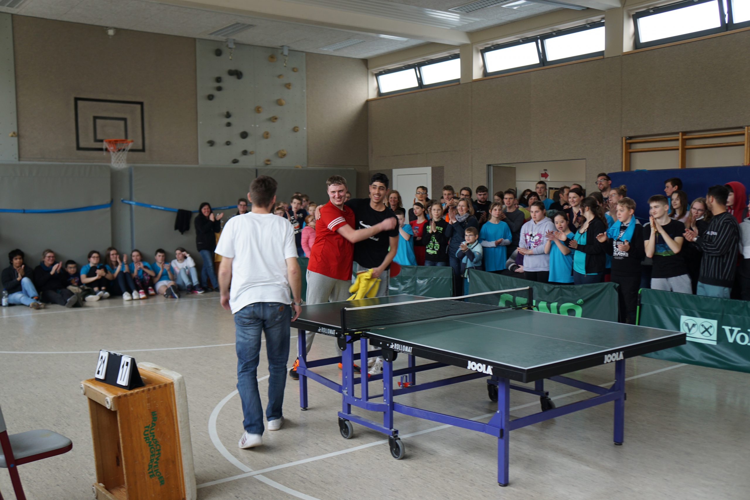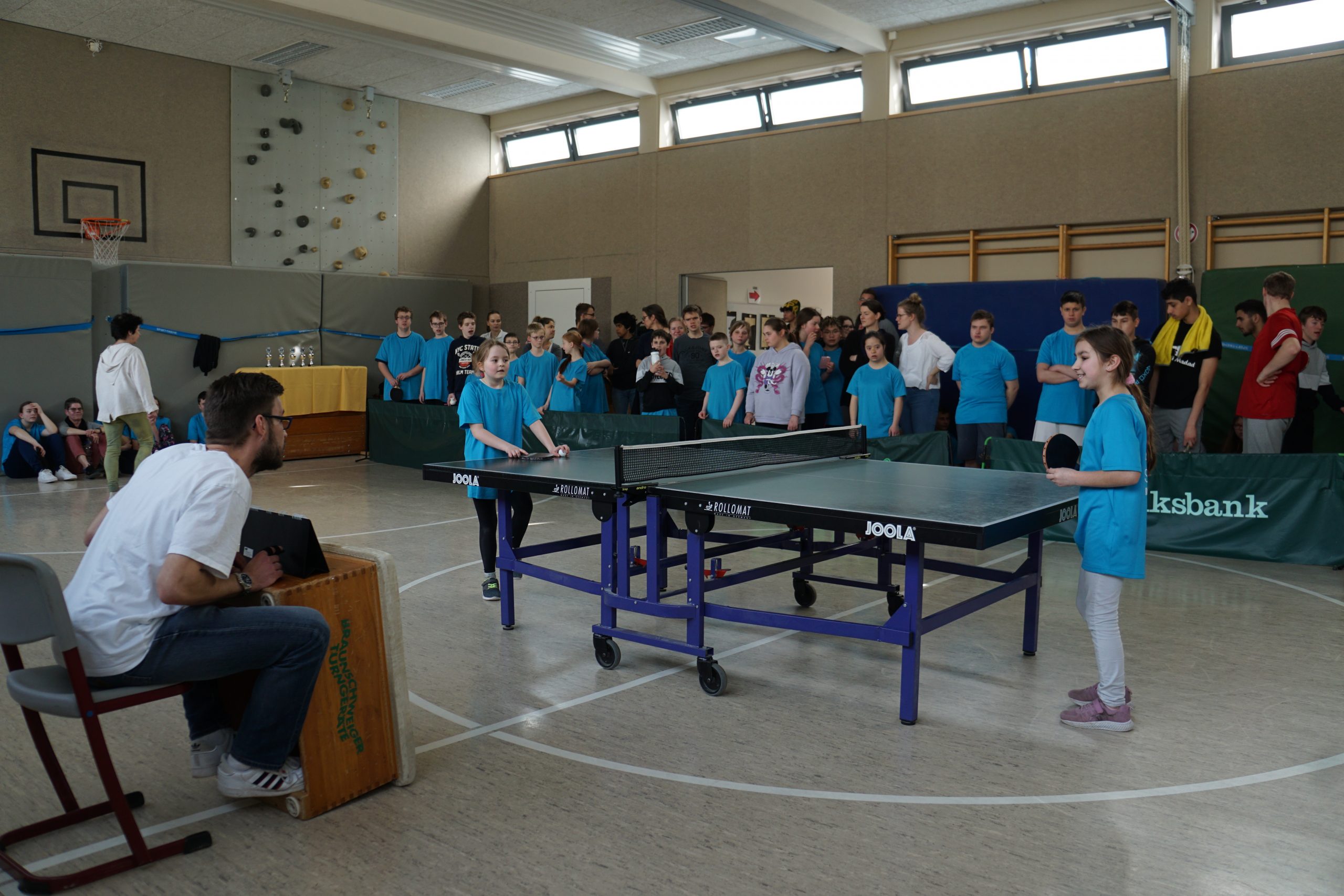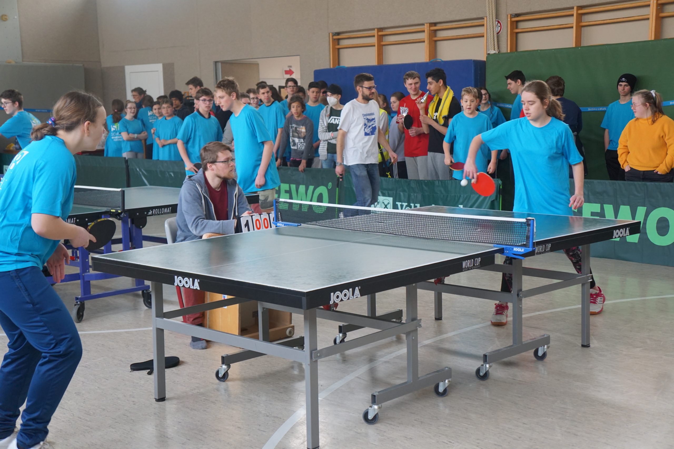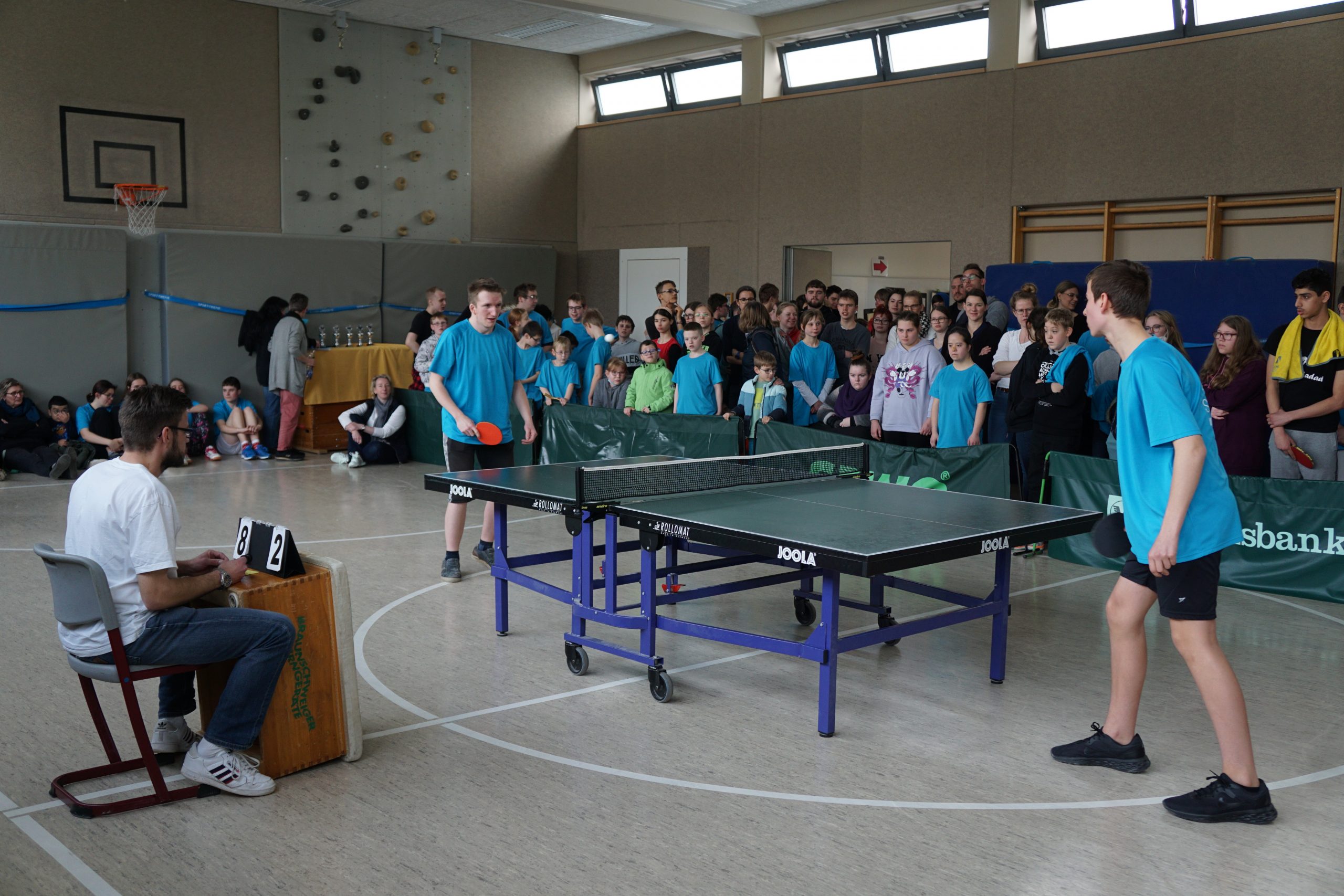 Nach dreijähriger Pause fand am 22. März 2023 wieder unser schuleigenes Tischtennis-Turnier statt. Gespielt wurde in den Wettkampfgruppen der Mädchen mit einer A-Klasse und einer B-Klasse. In der Wettkampfgruppe der Jungen in einer A-Klasse, B-Klasse und C- Klasse getrennt nach Anfängern und Fortgeschrittenen. An 9 Tischtennisplatten kämpften insgesamt 86 SchülerInnen um die begehrten Pokale und Urkunden. Nach 4 Stunden, in denen es viele spannende und großartige Spiele zu sehen gab, standen die Turniersieger fest. So konnte sich in der Jungen A-Klasse Dustin gegen seinen Mitschüler und langjährigen Trainingspartner Ali durchsetzen und belegte somit den 1. Platz. Weitere 1. Plätze bei den Jungen gab es in der Spielklasse B für Martin, der das Endspiel gegen Moritz für sich entscheiden konnte. In der Jungen C-Klasse schaffte es Jannik auf Platz 1, gefolgt von Leon auf dem 2. Platz. Bei den Mädchen bestritten Virginia und Emily das Endspiel der Mädchen A-Klasse. Dieses Spiel konnte für Virginia für sich klar entscheiden und belegte somit Platz 1 und Emily Platz 2. In der Mädchen B-Klasse trafen im Endspiel Delicia und Elia aufeinander. An der Stelle sei erwähnt, dass Elia eigentlich nicht am Turnier teilnehmen wollte. Delicia erreichte den 1. Platz und Elia einen tollen 2. Platz.