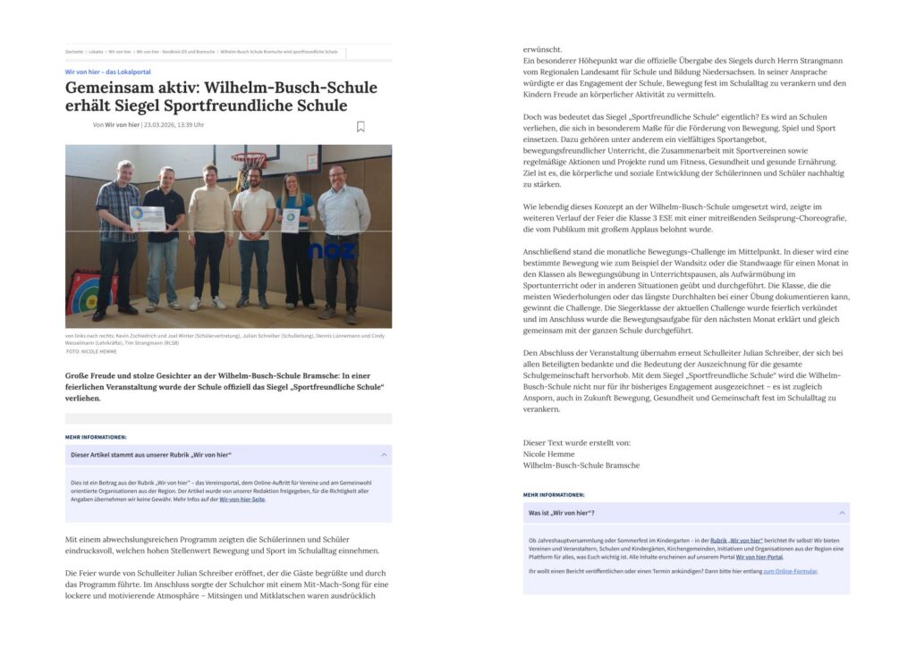 Große Freude und stolze Gesichter an der Wilhelm-Busch-Schule Bramsche: In einer feierlichen Veranstaltung wurde der Schule offiziell das Siegel „Sportfreundliche Schule“ verliehen.